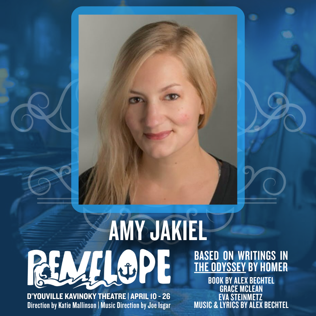 AMY JAKIEL (PENELOPE) is honored to take on the role of PENELOPE. Long time performer, first time weaver, Amy has been seen on various local stages. Favorite roles include Kate/Lucy in AVENUE Q (MusicalFare), Beard in KRAGTAR (Alleyway- Artie Award), Rona Lisa Peretti in SPELLING BEE (Second Generation Theatre), and Reza in ONCE (MusicalFare). Less glamorous but equally awesome roles include mom and middle school teacher. Love to Phil who will probably find time to come see the show eventually and a big shout out to Aunt Anne for the lobster and laughs.